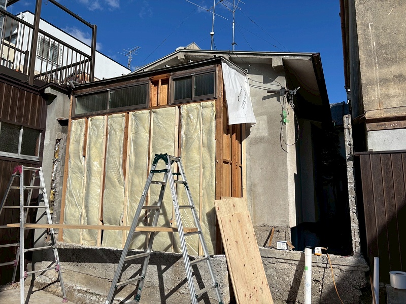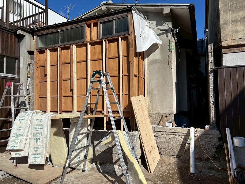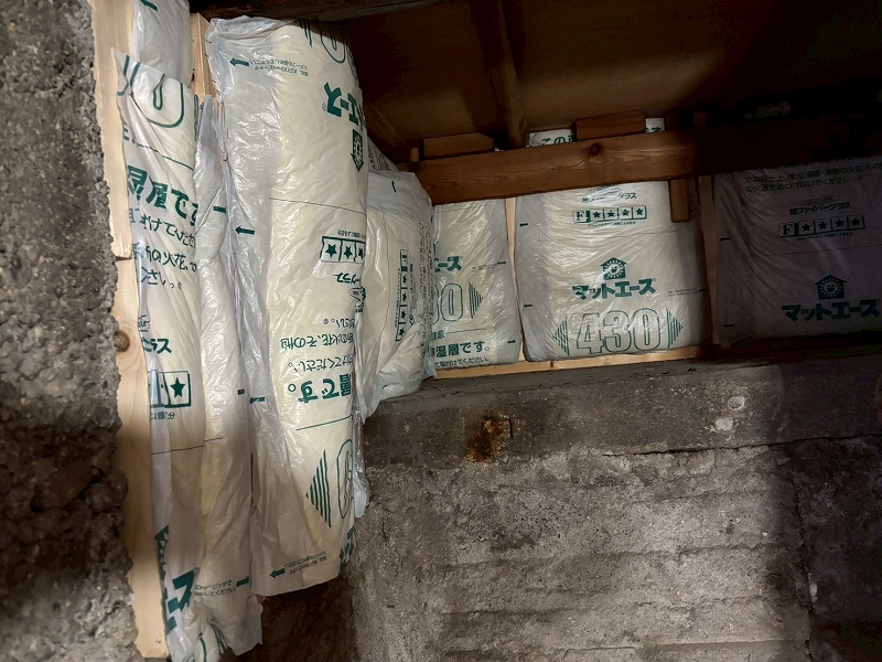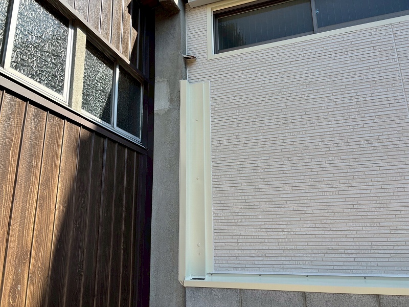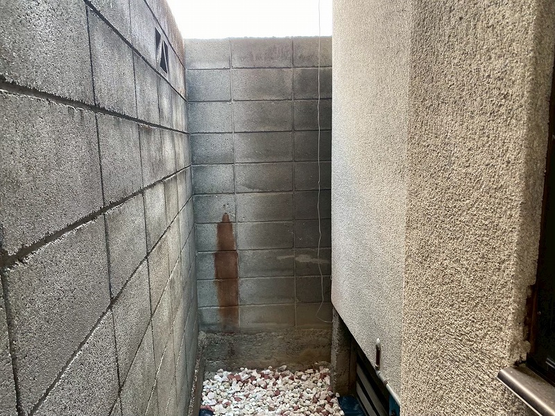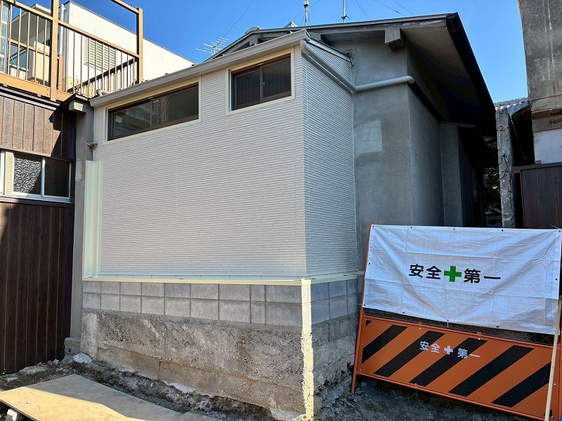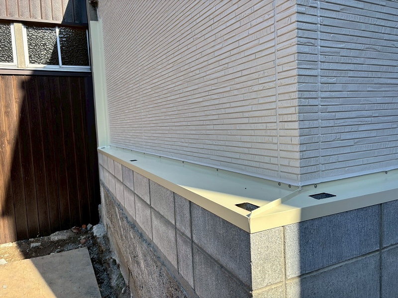 既存壁はブロックとの間に水切りがしてあるのみだったので、断熱材を入れてサイディングを張らせていただきました。