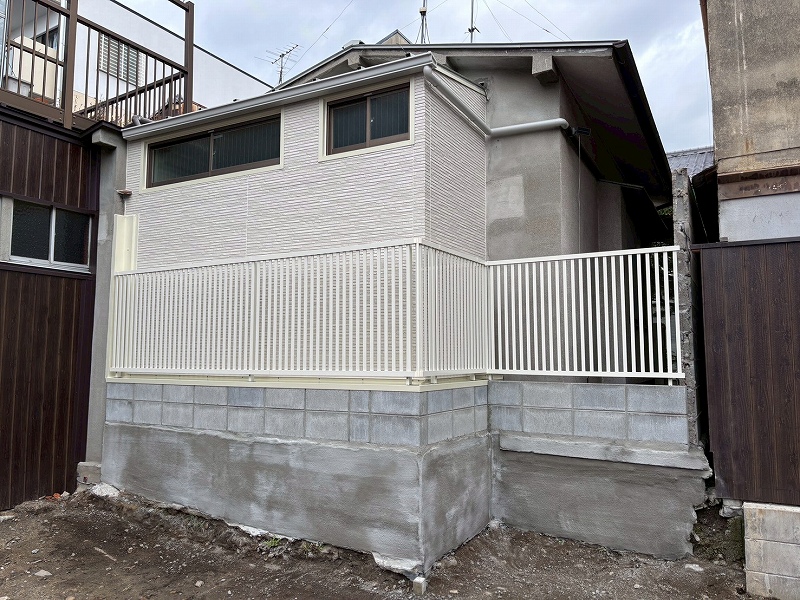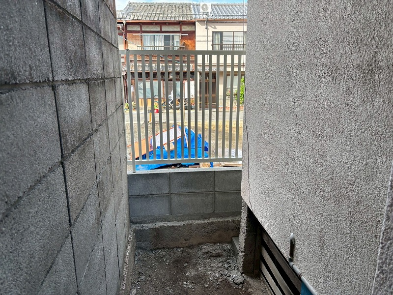 ブロックが高すぎて危険なので、アルミ製のフェンスに交換させていただきました。 既存壁はブロックとの間に水切りがしてあるのみだったので、断熱材を入れてサイディングを張らせていただきました。